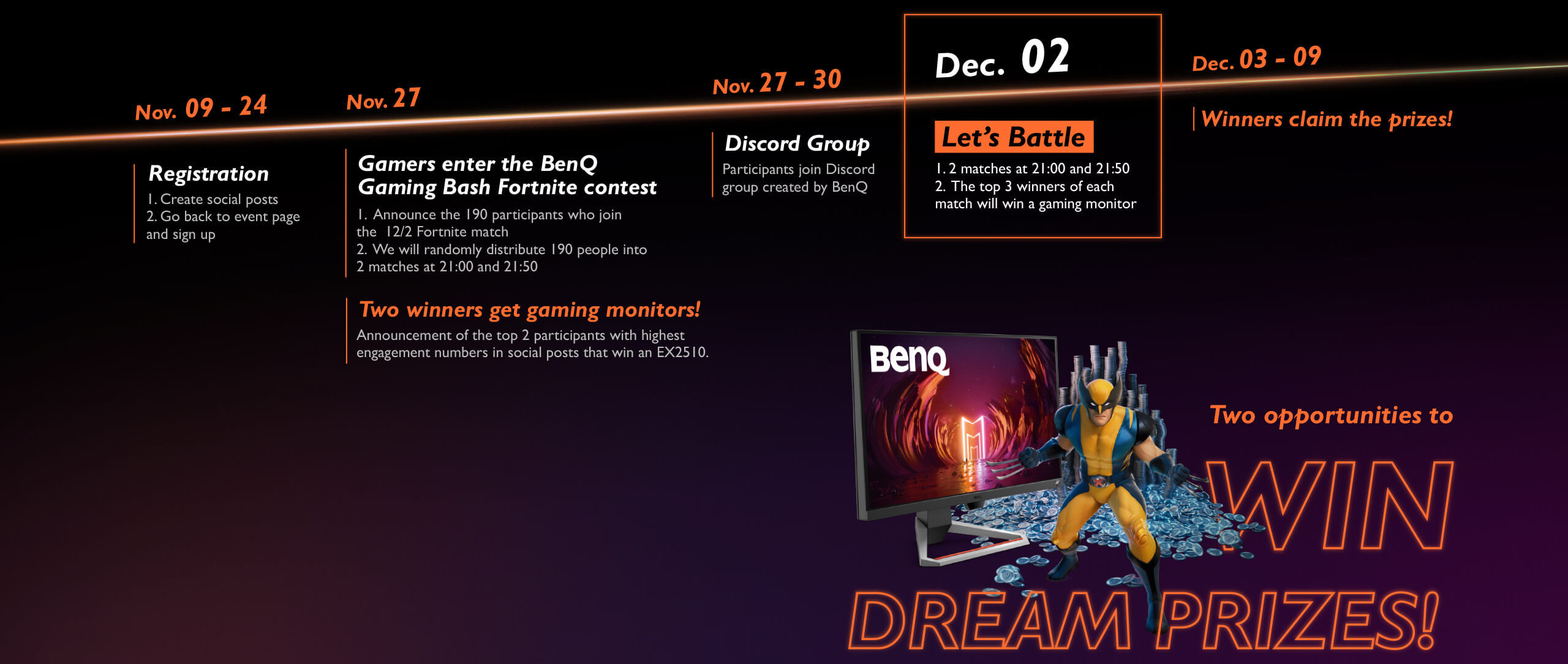 BenQ Gaming Bash Winter 2020 Edition will be two private solo matches on the Fortnite NA-EAST server: the first match will start at 9:00 pm (EST) and the second match at 9:50 pm (EST).