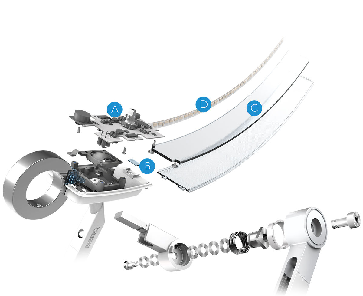 The light cap utilizes a lightweight aluminum alloy to dissipate the heat generated by the LED, thereby extending the lifespan of the LED over typical plastic caps. For torque springs, zinc alloy is used to enhance the stability and durability. All BenQ e-Reading Desk Lamp materials meet the restrictions in the EU Directive, RoHS (2002/95/EC).