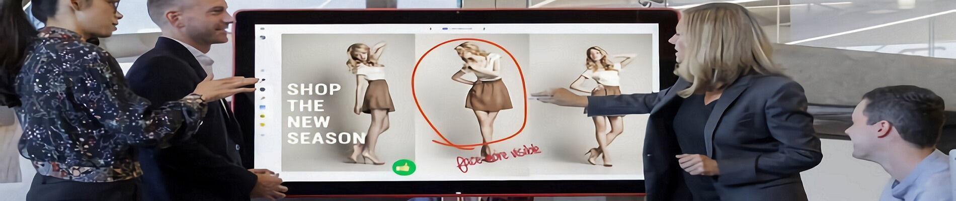 As a result, we collaborated via Jamboard. He shared with us the four different outfits the stylist had in mind and the photos immediately appeared on the digital whiteboard in our conference room. The Art Director was able to immediately discuss the options with the copywriter. After selecting the best photo, they were able to collaborate on-screen by enlarging the image, rotating it, and adding a frame. They were even able to draw and write directly on the screen.